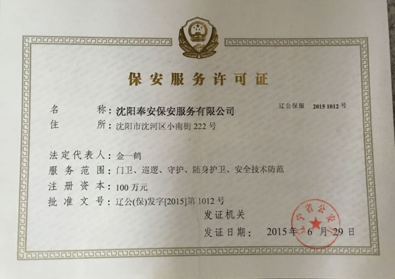 沈陽奉安保安服務(wù)有限公司(原沈陽市沈河區(qū)保安服務(wù)公司)創(chuàng)建于一九八八年八月,是遼寧省公安廳、沈陽市公安局批準(zhǔn),工商行政部門登記注冊,全市首家具備保安資質(zhì)的特殊性服務(wù)企業(yè),隸屬于沈陽市沈河區(qū)政府直管的全民國有企業(yè),現(xiàn)為中國保安協(xié)會會員單位和省保協(xié)、市保協(xié)常務(wù)理事單位:在全市同行業(yè)中率先通過ISO國際質(zhì)量認(rèn)證,是市工商局批準(zhǔn)的“重合同守信用”免檢單位和沈陽市政府采購中心保安服務(wù)項(xiàng)目重點(diǎn)競標(biāo)單位;擁有一支專業(yè)化、標(biāo)準(zhǔn)化、職業(yè)化的高素質(zhì)保安隊(duì)伍,是公安機(jī)關(guān)重要的輔警力量。
